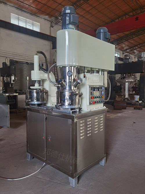 行星攪拌機是一種新型高效無死點混合攪拌設備。它具有獨特、新穎的攪拌形式。釜內有兩根或三根多層漿葉式攪拌器和一至兩個自動刮刀,攪拌器在繞釜體軸線公轉的同時,又以不同的轉速繞自身軸線自轉,使物料在釜體內作復雜的運動,受到強烈的剪切和搓合。此外設備內的刮壁刀繞釜體軸線轉動,將粘在壁上之物料刮下參于混合,使其效果更為理想。釜體采用特殊密封結構,可進行加壓及抽真空,具有良好的排氣除泡效果。缸體夾套可根據用戶需要進行加熱、冷卻。出料方式為壓料式,設備缸蓋可液壓升降,缸體可自由移動,操作十分方便。而且攪拌槳及刮刀可隨橫梁上升而完全脫離缸體,便于清潔。